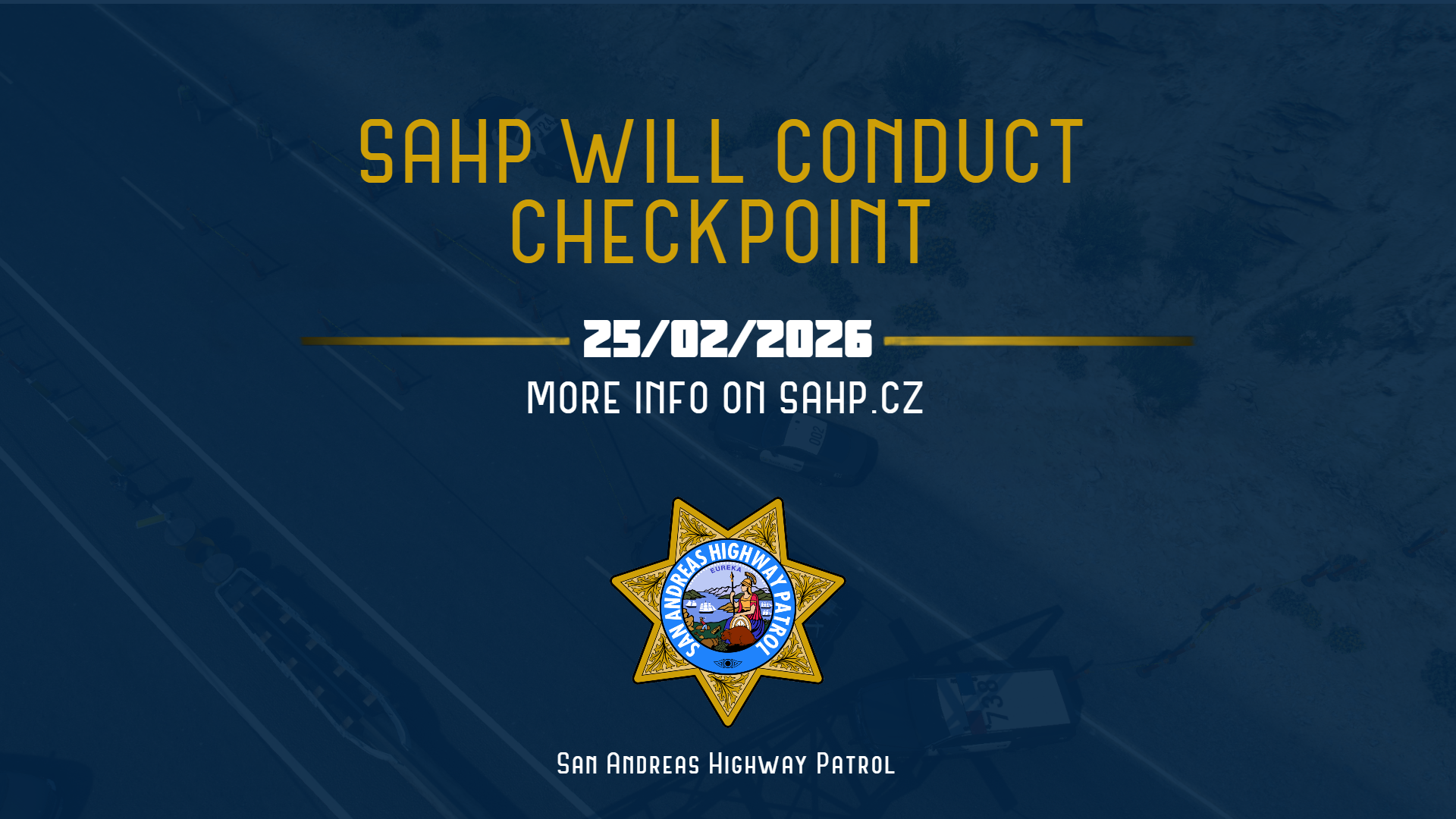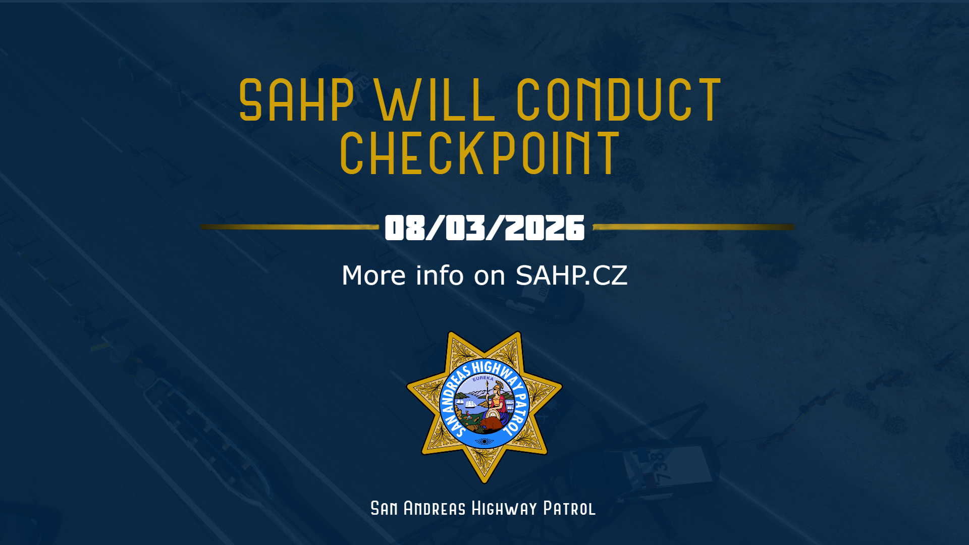 San Andreas Highway Patrol informuje o plánovaném DUI checkpointu zaměřeném na bezpečnost a dodržování předpisů silničního provozu.